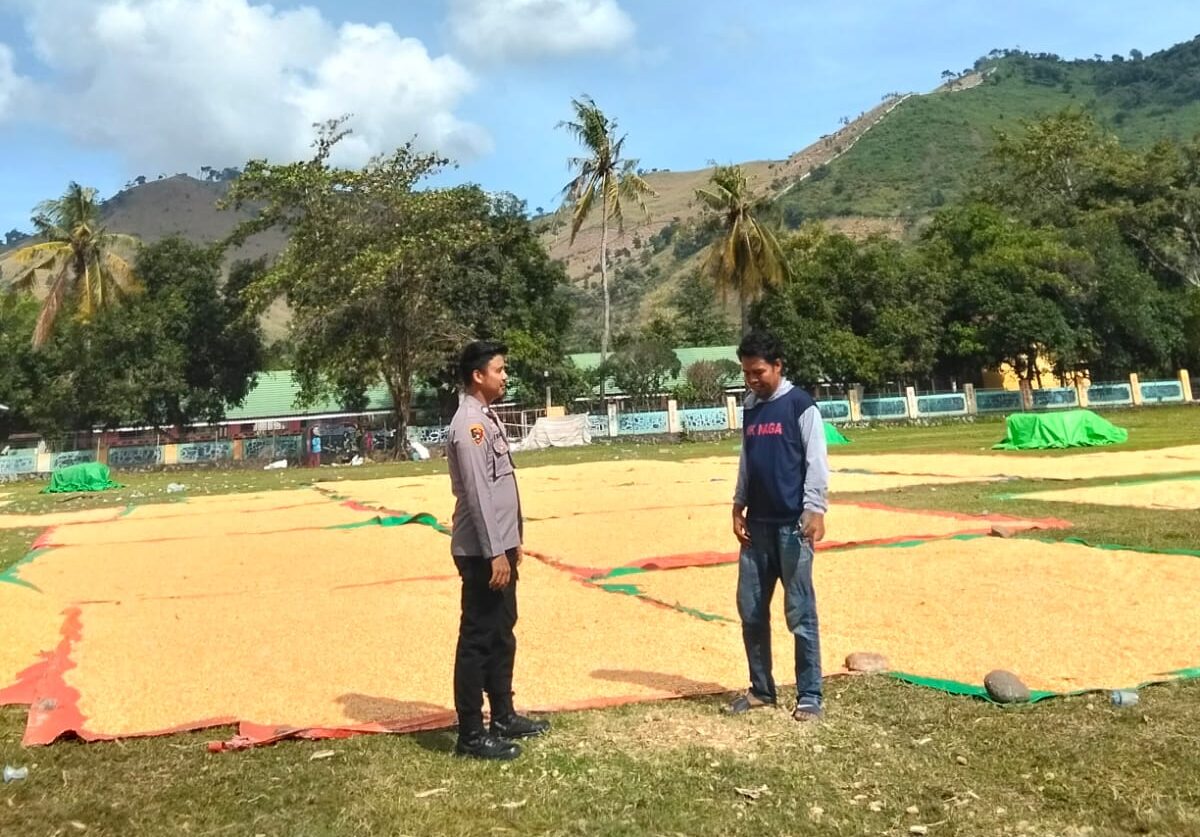 Dalam rangka mendukung program pemerintah terkait Ketahanan Pangan Nasional Menuju Indonesia Emas 2045, Bhabinkamtibmas Desa Sawe Polsek Hu’u, BRIPTU Imansyah, melaksanakan kegiatan pemantauan warga binaan yang sedang menjemur hasil panen jagung, Kamis (15/5/2025) pukul 10.00 Wita.