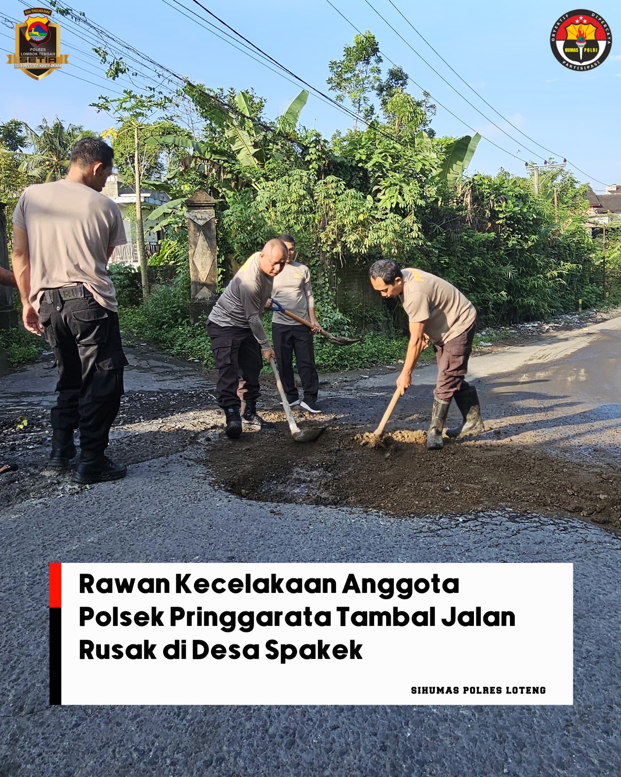 Lombok Tengah (NTB) – Dalam upaya menciptakan kenyamanan dan keselamatan bagi pengguna jalan, Kapolsek Pringgarata IPTU Nyoman Astika bersama anggota, pemerintah desa (Pemedes), dan masyarakat setempat melaksanakan aksi gotong royong menambal jalan rusak dan berlubang di Desa Spakekan, Kecamatan Pringgarata.