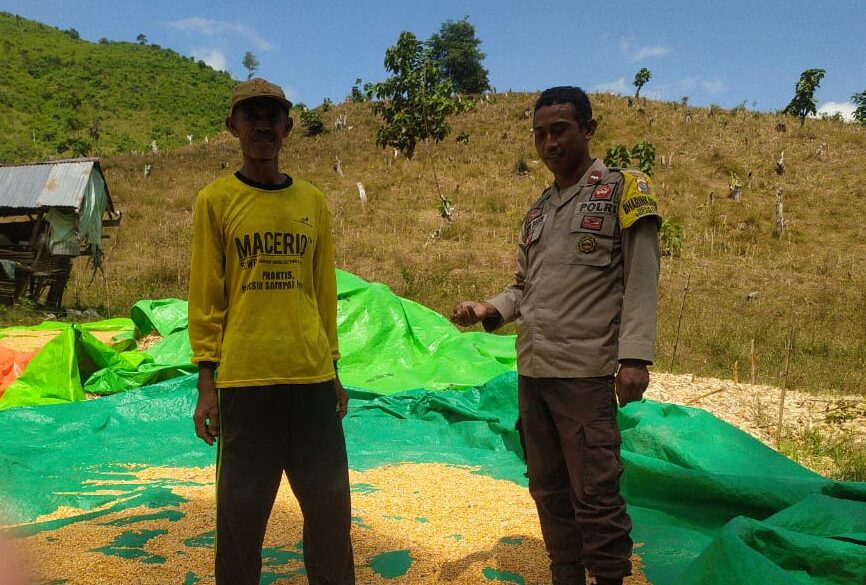 Bhabinkamtibmas Desa Ranggo Pantau Penjemuran Jagung Warga, Dukung Ketahanan Pangan Menuju Indonesia Emas 2045