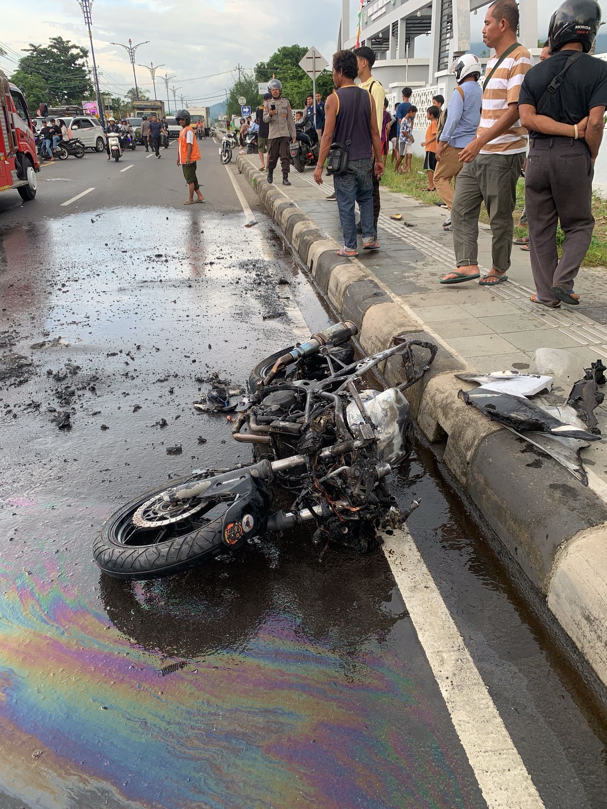 Akibat benturan tersebut, kedua pengendara terjatuh, dan sepeda motor Kawasaki Ninja terpental mengenai sepeda motor Yamaha NMAX dengan nomor polisi DR 5133 RD berwarna biru yang dikendarai oleh Zamhari (40). Benturan ini menyebabkan sepeda motor Kawasaki Ninja terbakar di lokasi kejadian.