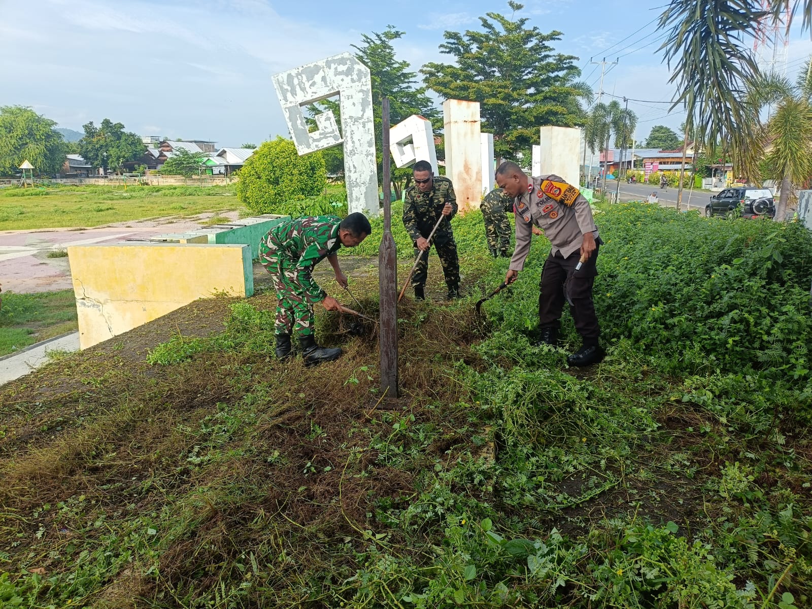Para peserta kegiatan bekerja bersama-sama membersihkan area taman, memotong rumput, serta merapikan fasilitas umum di sekitar lokasi. Kegiatan ini juga merupakan bentuk nyata dari sinergi antara TNI, Polri, pemerintah, dan masyarakat dalam menjaga kebersihan dan kelestarian lingkungan.