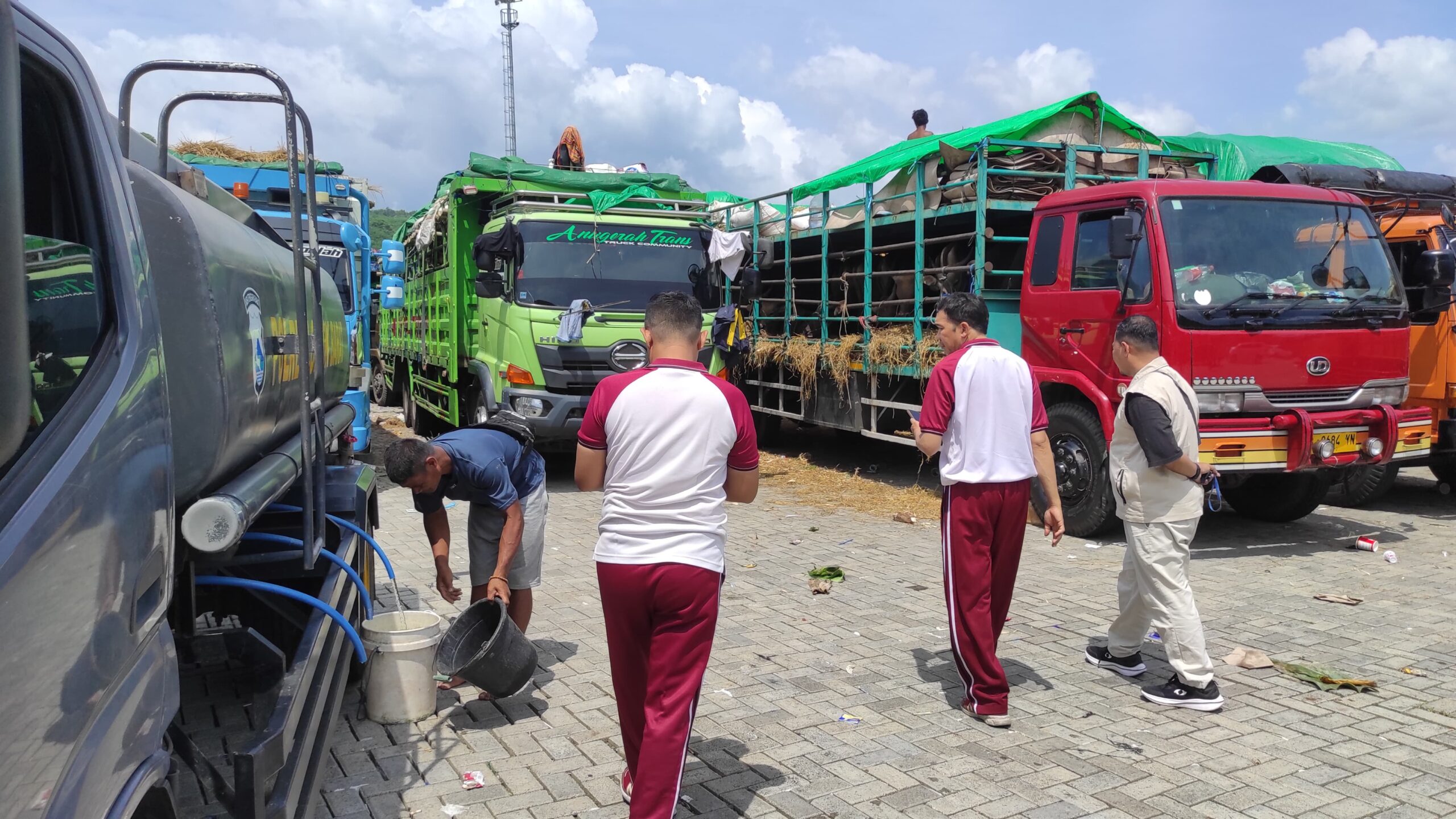 Dalam situasi cuaca panas ekstrem yang melanda, kepolisian bergerak cepat menyalurkan bantuan air bersih guna memenuhi kebutuhan vital ratusan ekor sapi yang siap diberangkatkan menuju Pulau Jawa.