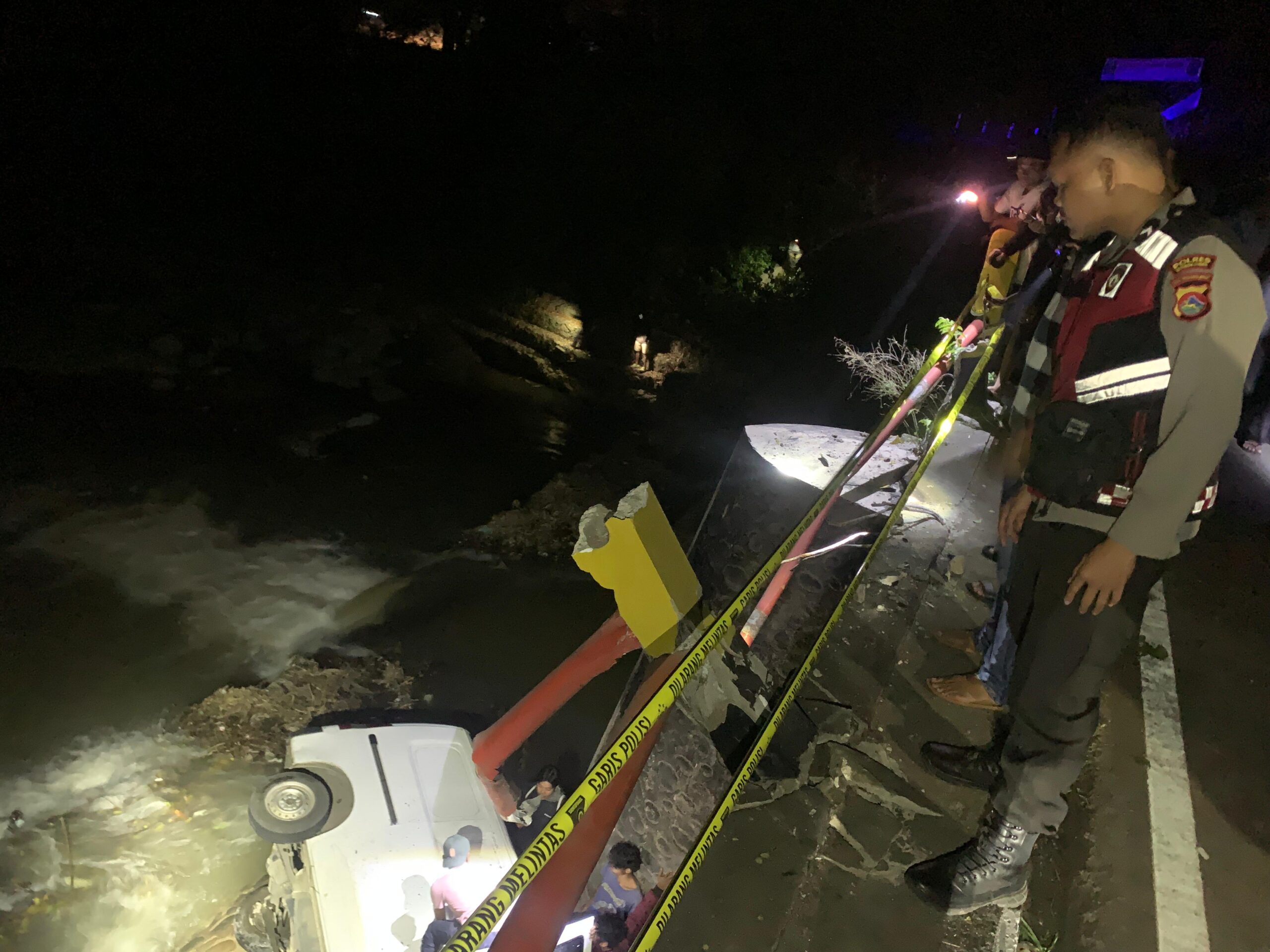 “Kondisi jalan yang sedikit berpasir ditambah kecepatan tinggi membuat pengemudi kehilangan kendali. Akibatnya, kendaraan menabrak pembatas dan terperosok ke sungai,” jelas Kapolsek.