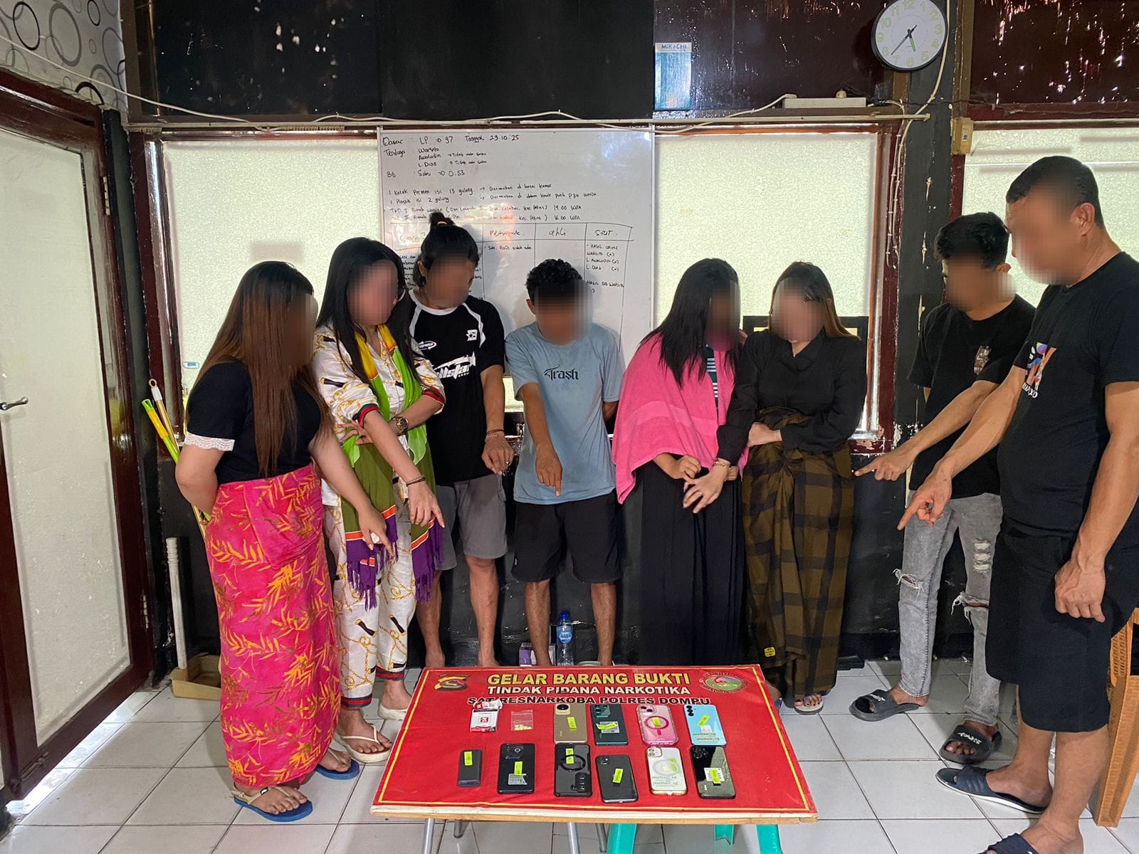 Tim Opsnal Satuan Reserse Narkoba (Satresnarkoba) Polres Dompu berhasil mengamankan 8 (delapan) orang terduga pelaku tindak pidana narkotika jenis pil ekstasi (inex) dalam sebuah penggerebekan di sebuah kos-kosan di Lingkungan Salama, Kelurahan Bada, Kecamatan Dompu, Kabupaten Dompu, pada Minggu, 23 November 2025 sekitar pukul 06.00 WITA.